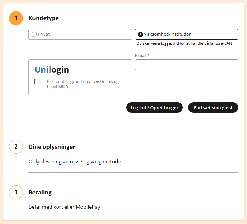 Hvis du er elev eller handler privat, skal du vælge kundetypen Privat.